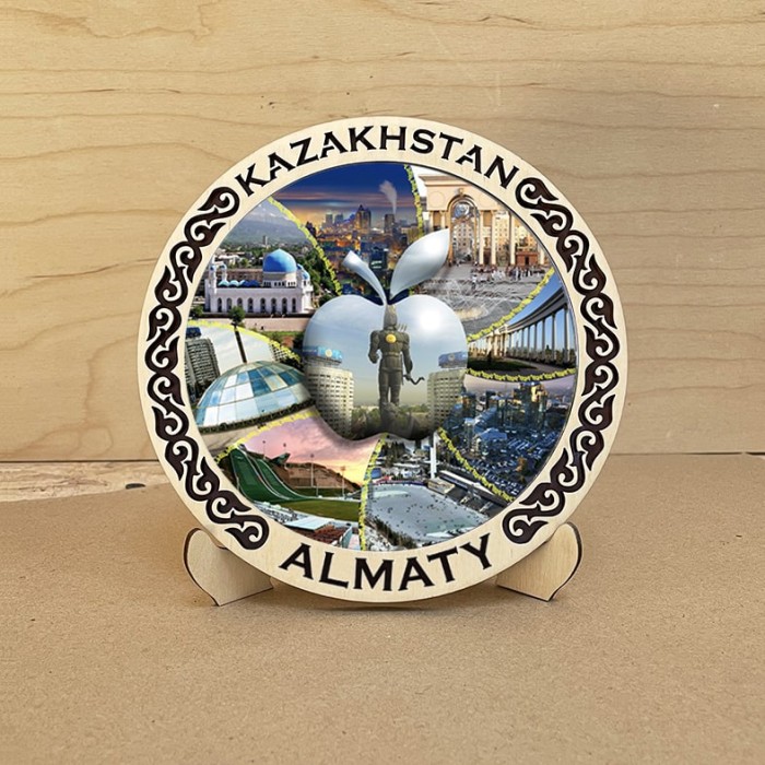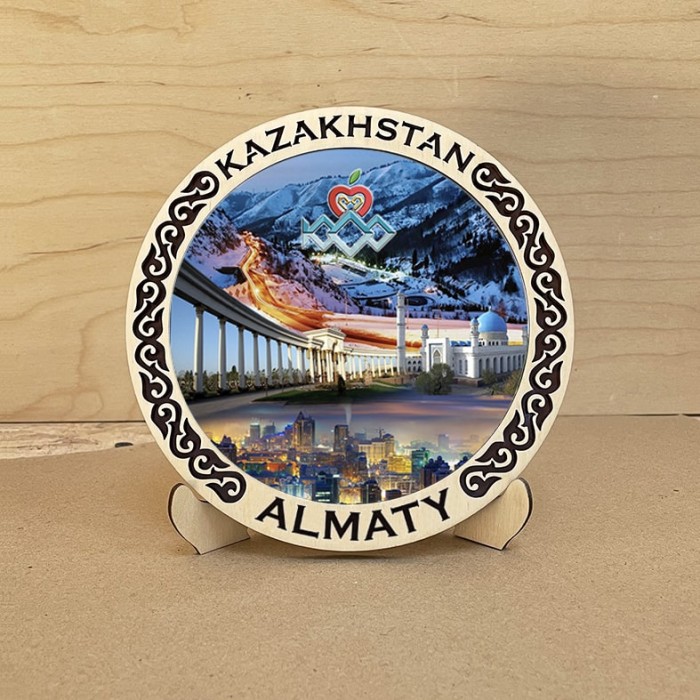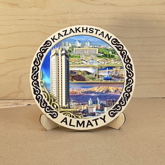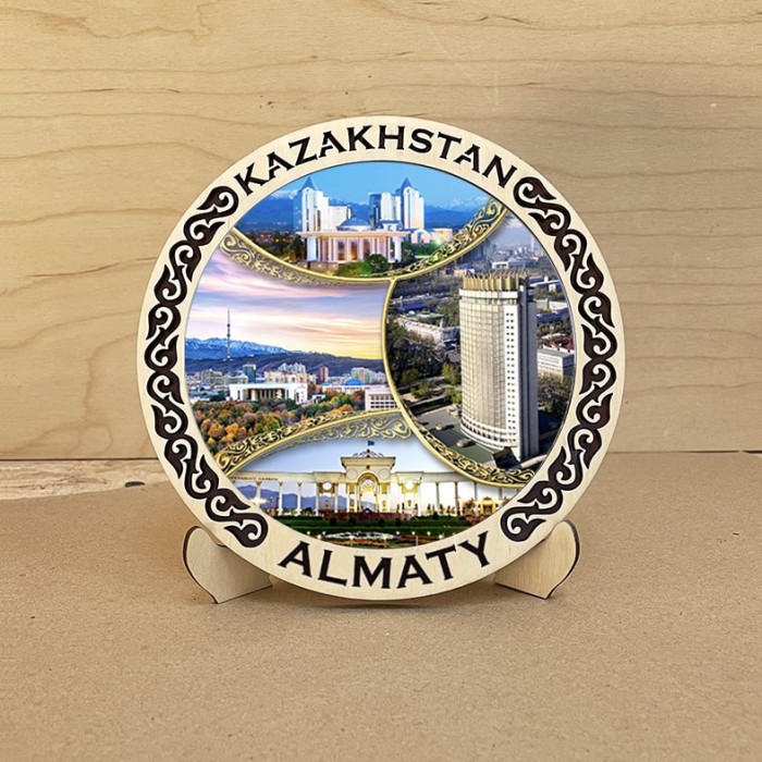 Тарелка деревянная с фото Орнамент 20 см. АлматыТарелка упакована в индивидуальную картонную коробку.В комплекте ножки для тарелки....