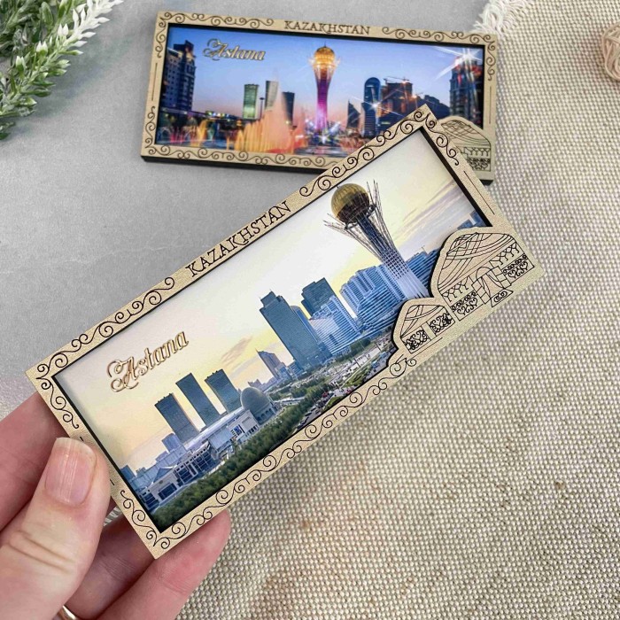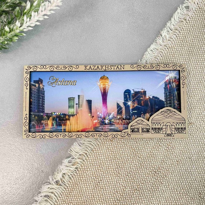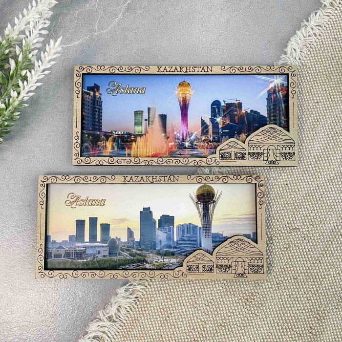 Магнит деревянный рамка панорама Юрта Астана с фотопечатью Магнит упакован в индивидуальный полипропиленовый пакетик....