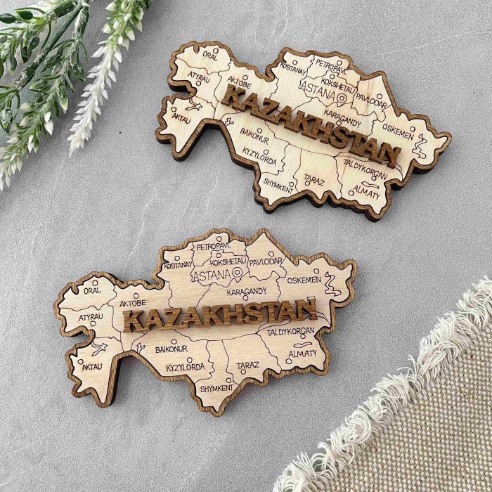 Магнит деревянный Карта Казахстана. Магнит упакован в индивидуальный полипропиленовый пакетик....
